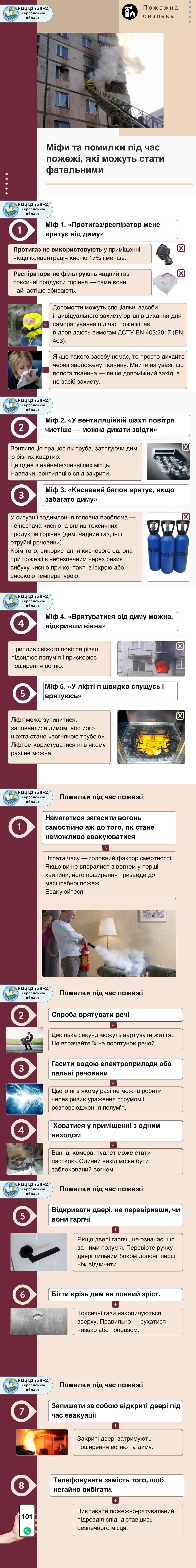 Розвінчування найпоширеніших міфів, а також роз'яснення, як діяти правильно під час пожежі — на інфографіці від Навчально-методичного Центру ЦЗ та БЖД Херсонської області.