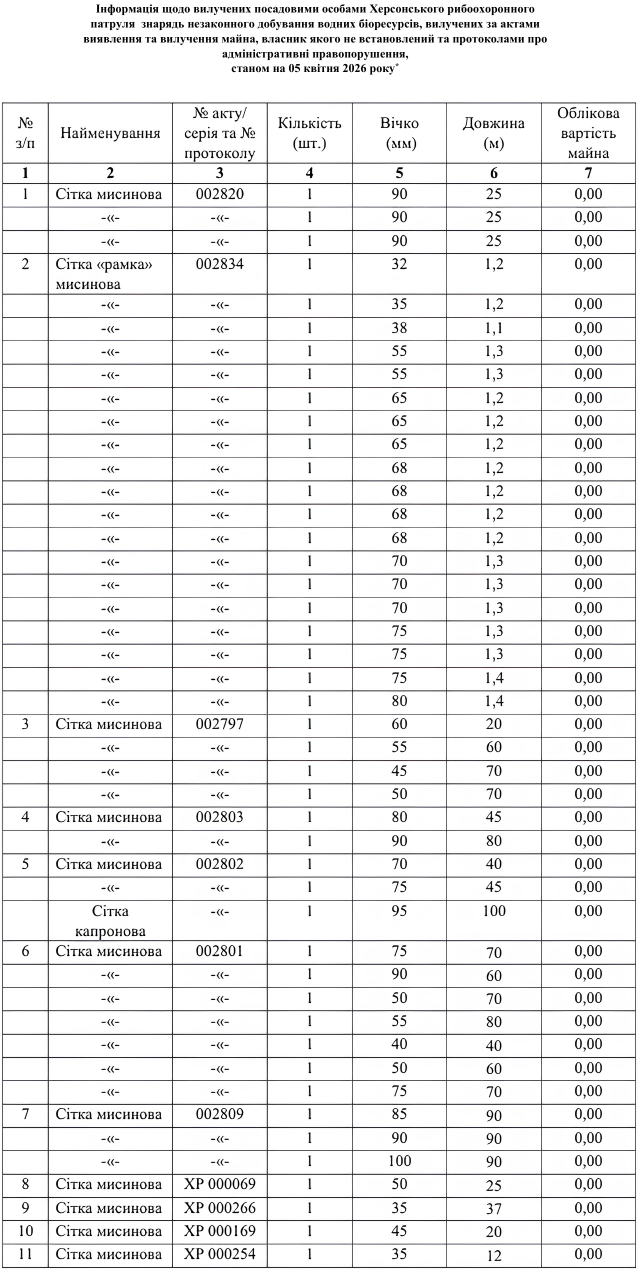 Херсонський рибоохоронний патруль інформує про вилучені знаряддя незаконного добування об’єктів тваринного світу, які тимчасово зберігаються в приміщенні Миколаївського рибоохоронного патруля.