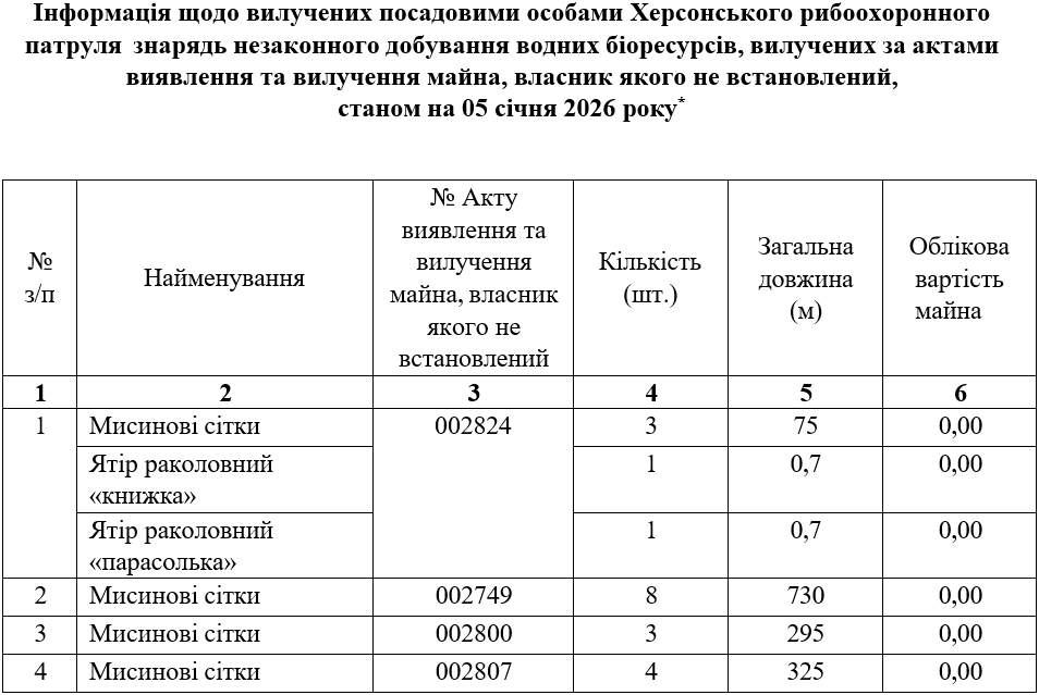 Херсонський рибоохоронний патруль інформує про вилучені знаряддя незаконного добування об’єктів тваринного світу, які тимчасово зберігаються в приміщенні Миколаївського рибоохоронного патруля.