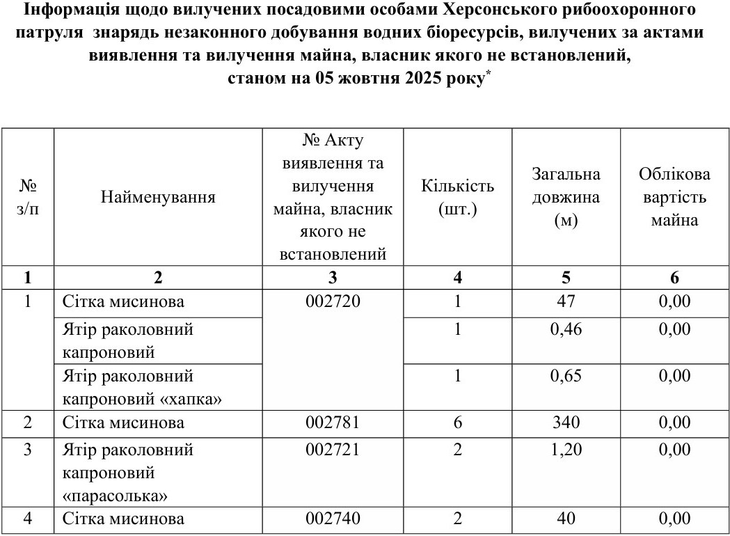 Херсонський рибоохоронний патруль інформує про вилучені знаряддя незаконного добування об’єктів тваринного світу, які тимчасово зберігаються в приміщенні Миколаївського рибоохоронного патруля.