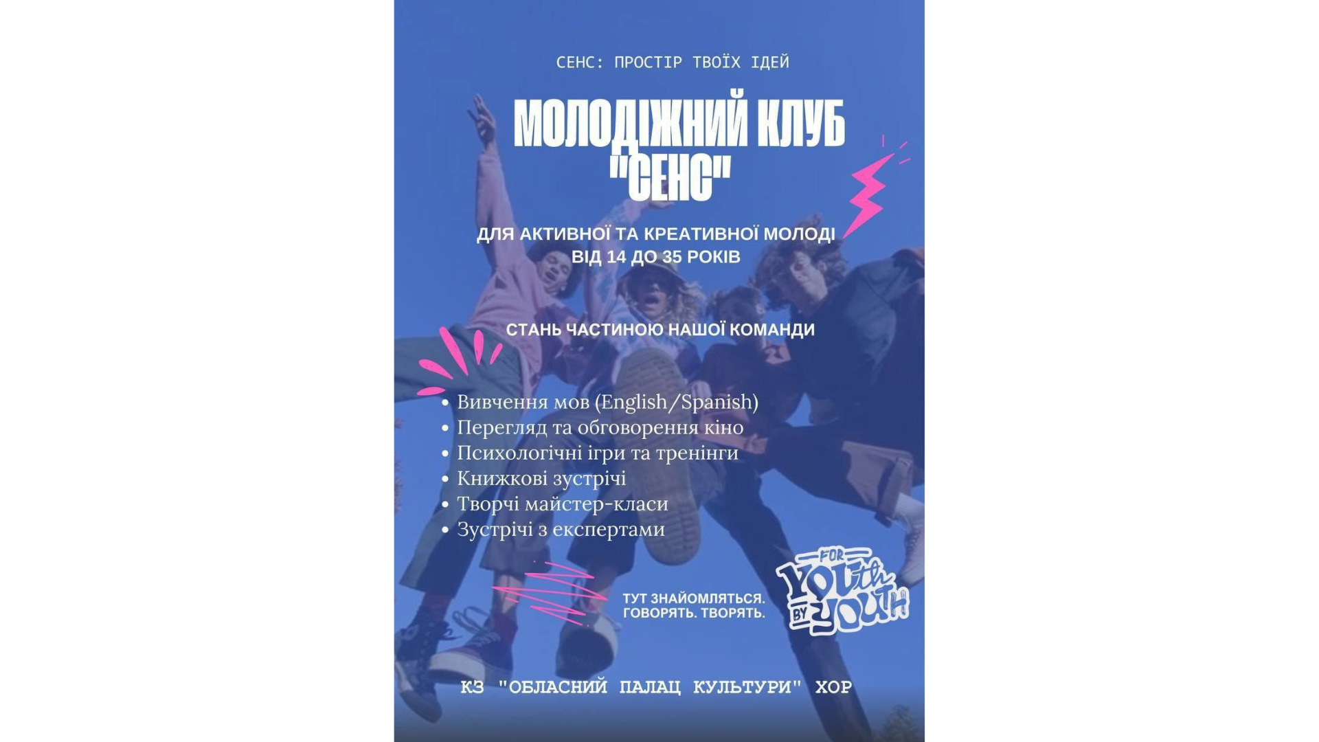 Програма клубу «Сенс» охоплюватиме різноманітні формати для саморозвитку та дозвілля. Організатори готують розмовні клуби з іноземних мов, перегляди кіно з подальшими дискусіями та психологічні ігри.
