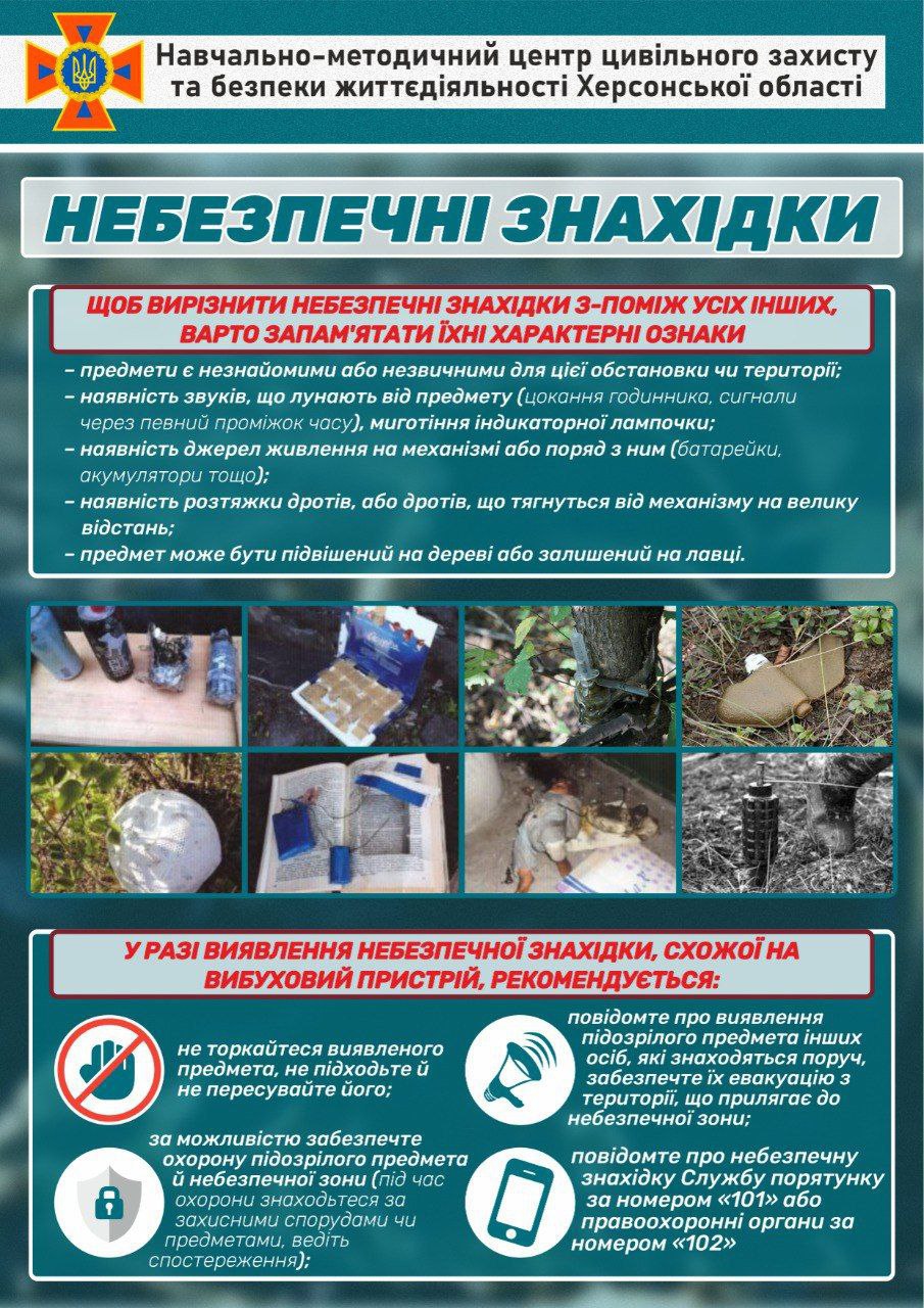 ℹ️ Детальніше про ознаки небезпечних знахідок та алгоритму дій у разі їх виявлення — у пам'ятці від Навчально-методичного центру ЦЗ та БЖД Херсонської області.