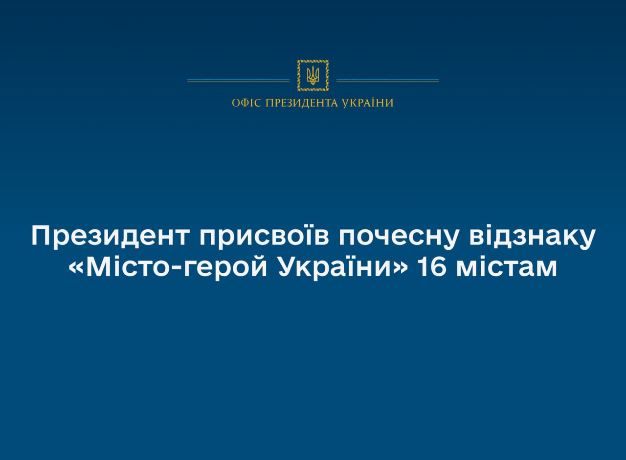 Президент України Володимир Зеленський підписав указ про присвоєння почесної відзнаки «Місто-герой України» 16 містам у семи областях. Це Баштанка, Вознесенськ, Гуляйполе, Дружківка, Костянтинівка, Краматорськ, Куп’янськ, Марганець, Нікополь, Оріхів, Павлоград, Покровськ, Слов’янськ, Старокостянтинів, Суми й Тростянець.