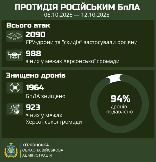Тільки минулого тижня окупанти запустили по громадах правобережжя майже 2100 БпЛА, з яких понад 1960 – були знищені українськими військовими.