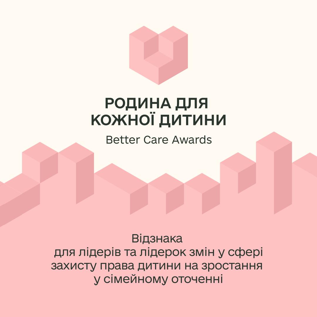 «Родина для кожної дитини. Better Care Awards» – це відзнака для людей, які створюють найкращі умови для кожної дитини. Номінуватися можуть люди, ініціативи, громади, області та бізнеси.